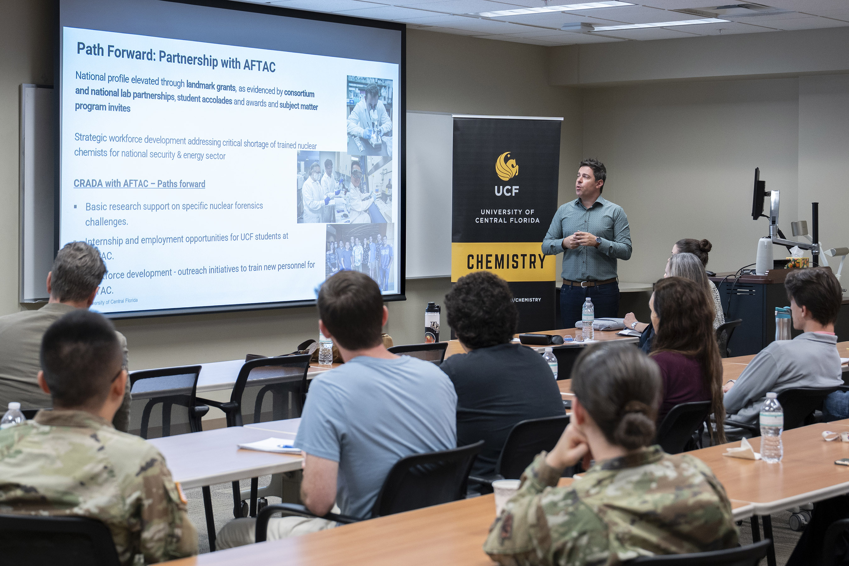 First Lt. Piper Gray, a nuclear physicist and chemistry team lead at the U.S. Air Force Radiochemistry Laboratory headquartered at the Air Force Technical Applications Center, Patrick Space Force Base, Fla., delivers an in-depth presentation to chemistry students studying under Associate Professor Dr. Vasileios Anagnostopoulos, UCF’s Director of Nuclear Regulatory Commission Fellowships, about AFTAC’s role in global nuclear forensics and radiochemistry lab practices in the role of nuclear treaty monitoring. The visit was in support of the Educational Partnership Agreement the two organizations share. (U.S. Air Force photo by Matthew S. Jurgens)